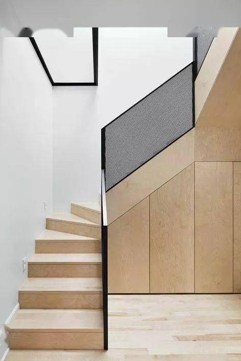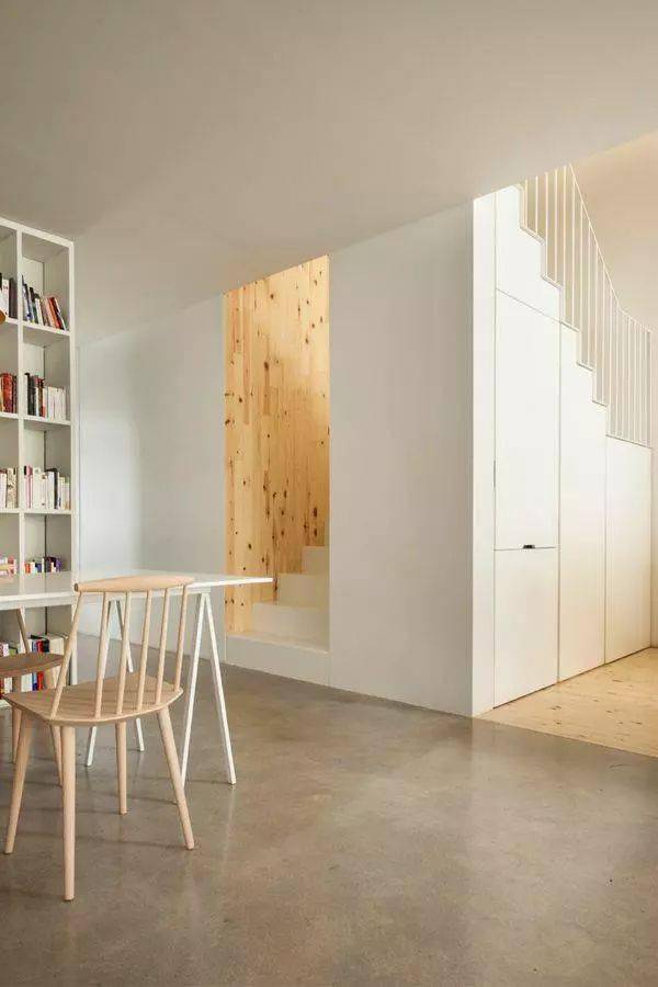 如果你喜欢立面比较统一干净的样式,也可以让无拉手的柜子和楼梯融为一体,摒弃了多余的装饰,可以让空间显得更简洁、更美观。