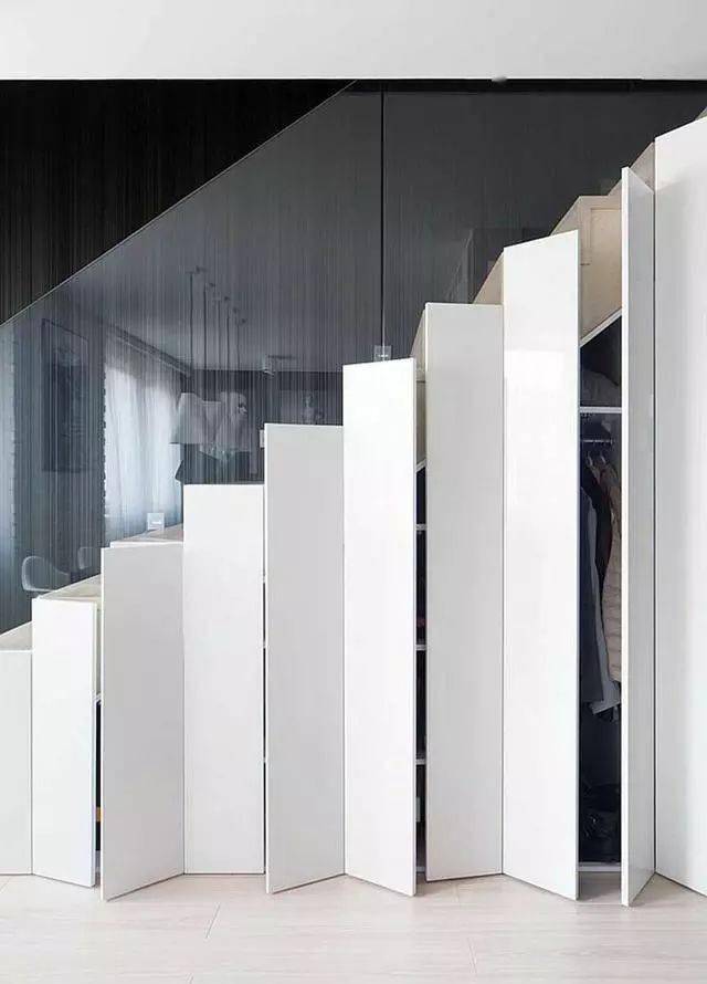 特别是对于收纳需求比较大的家庭而言,根据楼梯的层层递进,将其下方空间和定制的收纳柜相结合,造型上顺势抬高,既能有效利用空间,又可以摆放大量的杂物,是一个非常不错的选择。