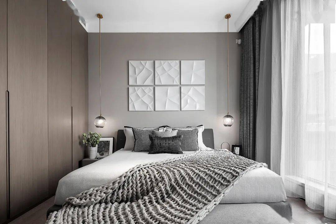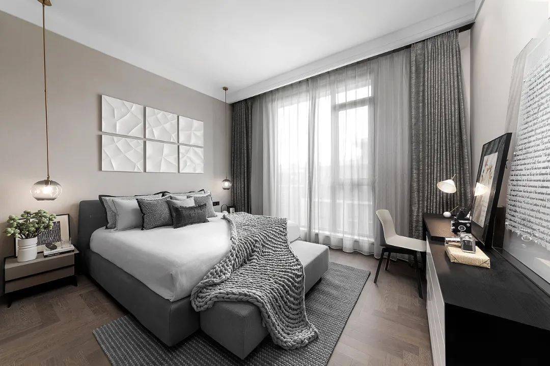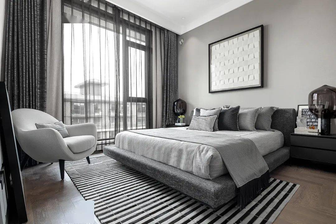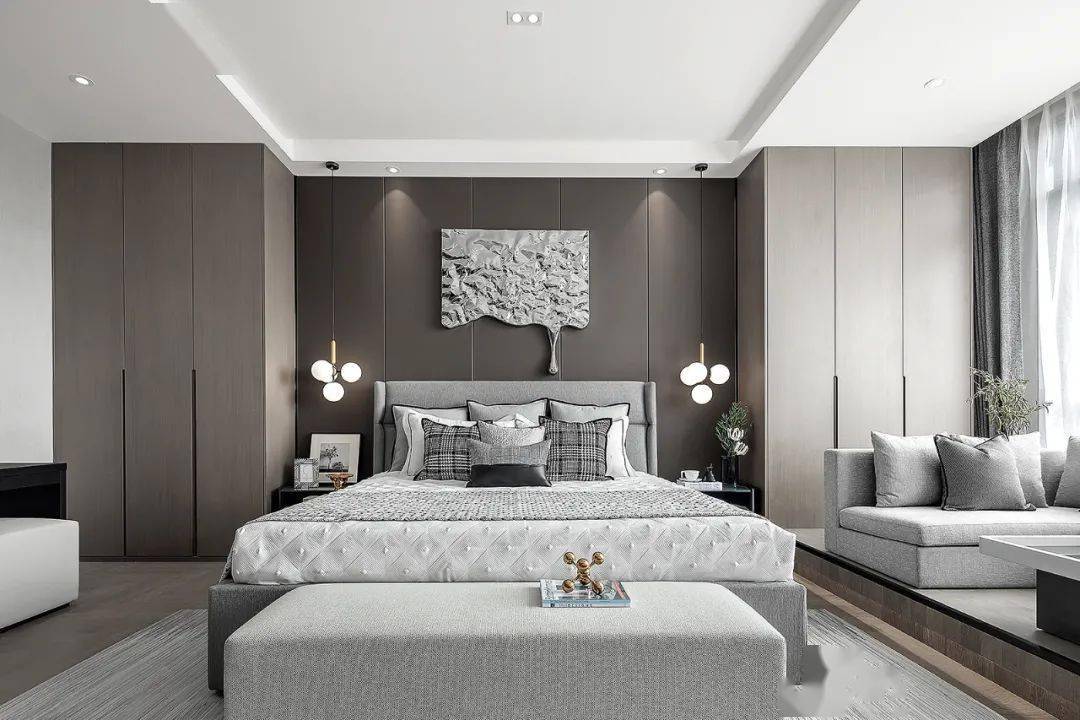 高级灰与木色的巧妙搭配,主卧空间的质感油然而生。不同材质的碰撞丰富着设计层次,从金属到布面,从木饰到石材,起承转合间是对空间深层解读后的用心诠释。